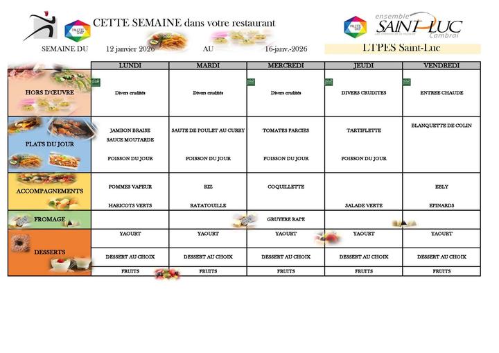 Menus restaurant scolaire Veuillez retrouver ici le menu de votre restaurant pour la semaine du 12/01/2026 au 16/01/2026.